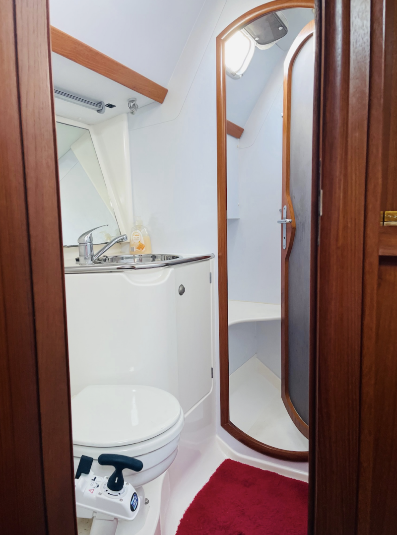 At the front of the boat, you’ll find the guest cabin with its own toilet and washbasin. Everything here is in spotless, like-new condition, making guests feel right at home from the moment they step in.
